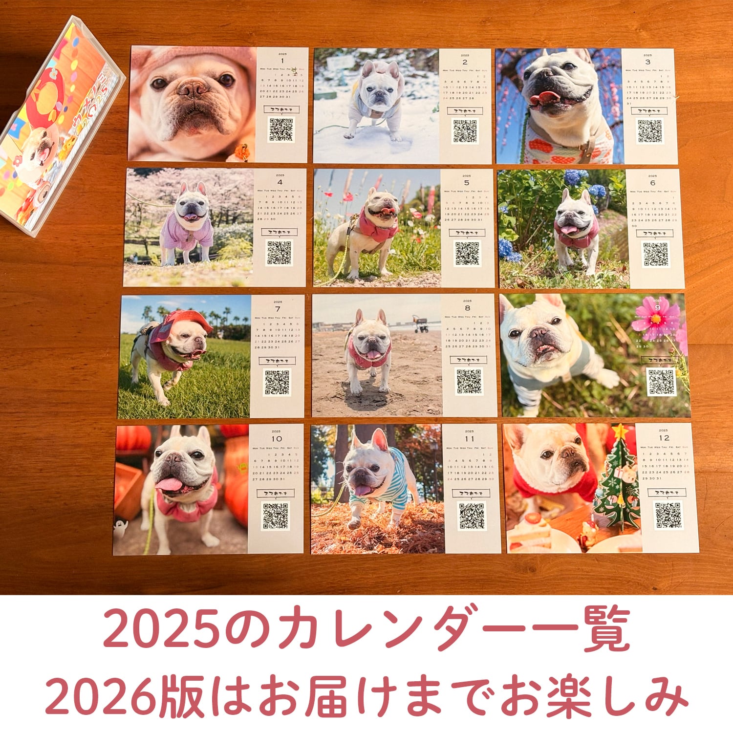 フレンチブルドッグこうめさんとの日々の暮らしから撮りためた写真や動画を、月曜始まりの月毎のカレンダーにしました。